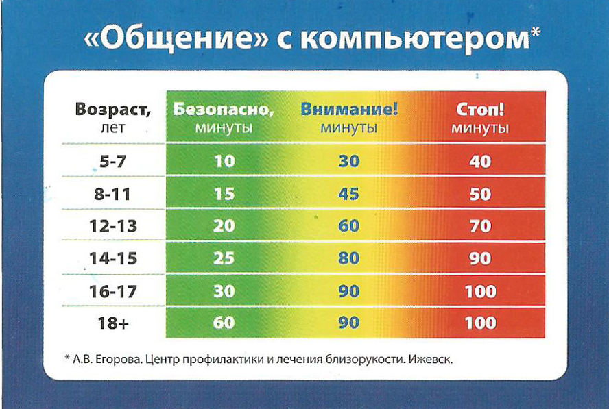 Работа за компьютером: монитор не менее чем в 40 см от глаз, читаемые шрифты – 12-14. Следует в разумных пределах ограничивать время, проведенное за гаджетами.
